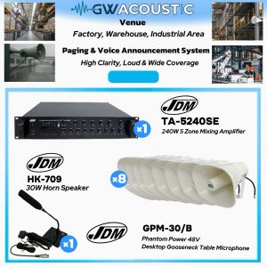 JDM 240W 5 Zone PA System | 8x 30W Horn Speaker + Gooseneck Mic | Industrial/Warehouse Paging & Announcement