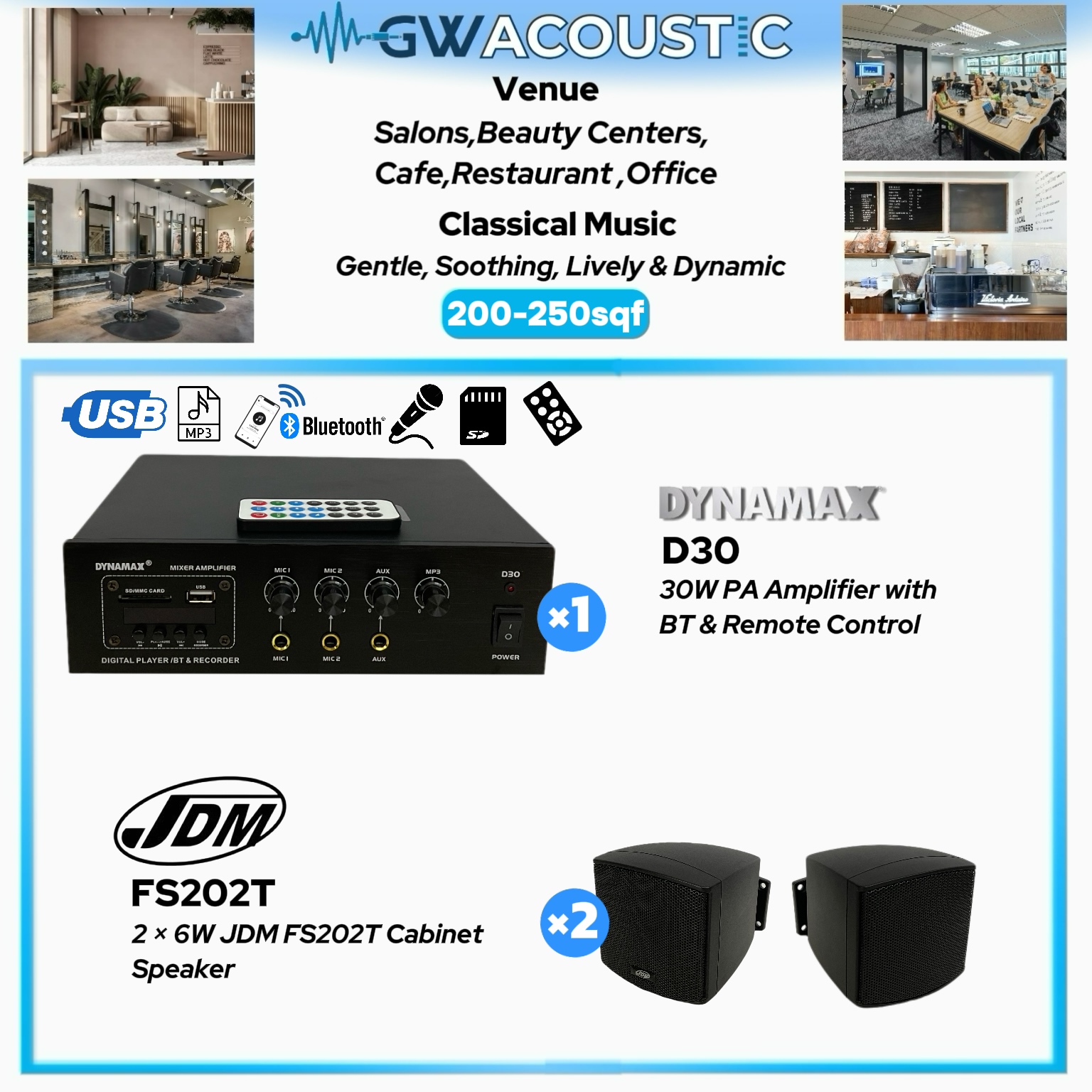 Be the first to review “Dynamax D30 Amplifier + 2 unit JDM FS202T 2.5″ Wall Speaker Package”