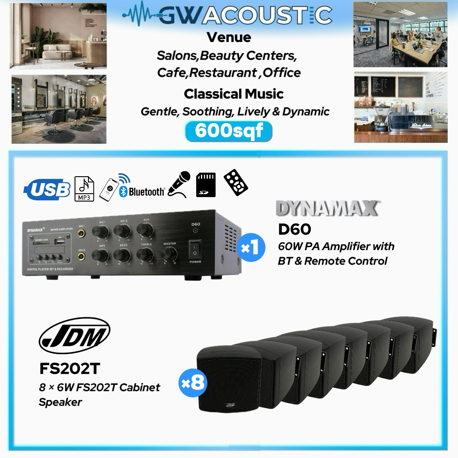 Be the first to review “Dynamax D60 Amplifier + 8 unit JDM FS202T 2.5″ Wall Speaker Package”