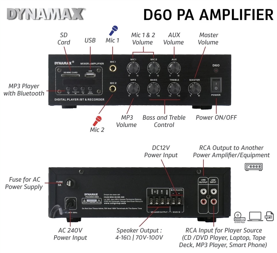 Dynamax D30 30W / D60 60W PA Public Address Amplifier Amp System With Bluetooth, USB, MP3
