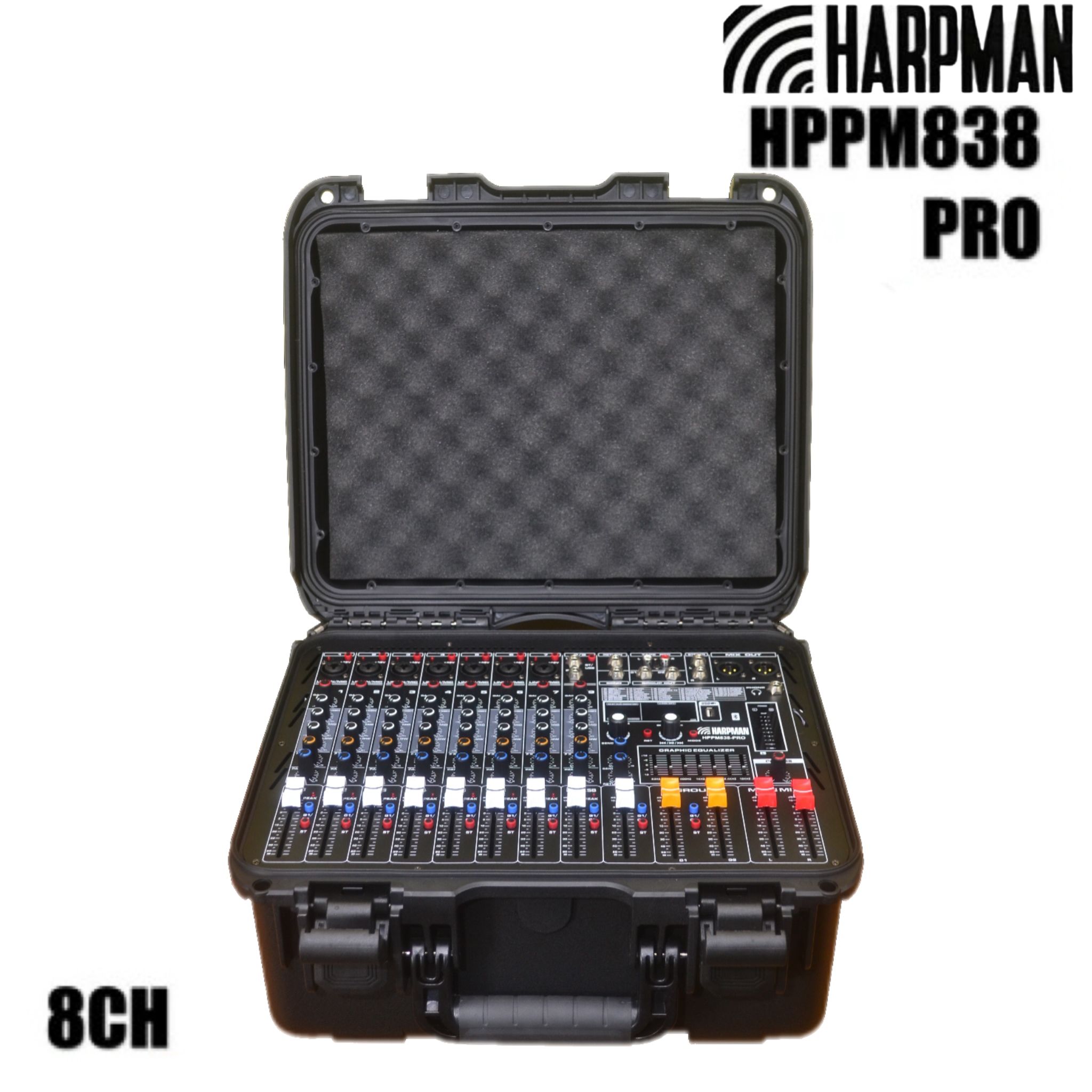 Harpman HPPM838PRO 8 Channel 500 Watts x 2 Powered Mixer with Digital Effects, 48V Phantom Power, 7 Band Equalizer & Bluetooth/USB c/w Portable Carrying Case